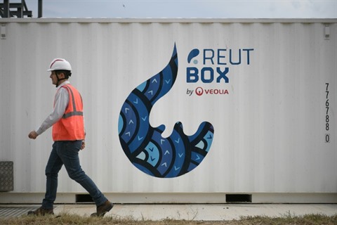 Dans la station d'épuration de Narbonne (Sud de la France), comme dans cinq autres dans le pays, l'opérateur Veolia a mis en service en 2021 une "Réut Box", une infrastructure tenant dans un conteneur qui assure une étape supplémentaire de traitement de l'eau provenant des égouts.