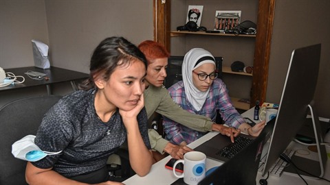 | Fatemeh, Sude et Ataa travaillant dans le cadre d'un projet sur l'égalité des genres à Athènes, le 15 juin 2021. |