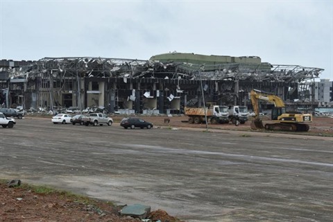 | Des bâtimeents ravagés par les explosions, à Bata le 24 mars. |