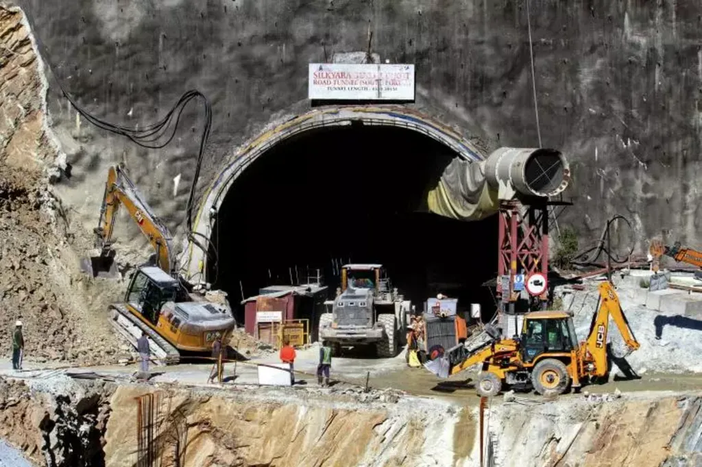 Des excavatrices ont déjà extrait des tonnes de terre, de béton et de gravats à la suite de l'effondrement du tunnel en construction, le 12 novembre, dans l'État himalayen de l'Uttarakhand.