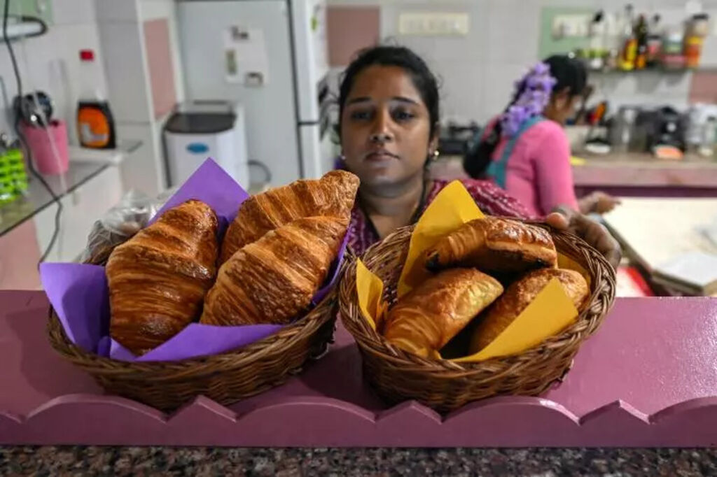 | Une employée prépare des croissants dans la boulangerie "Eat My Cake" à Pondichéry, en Inde, le 18 janvier. |