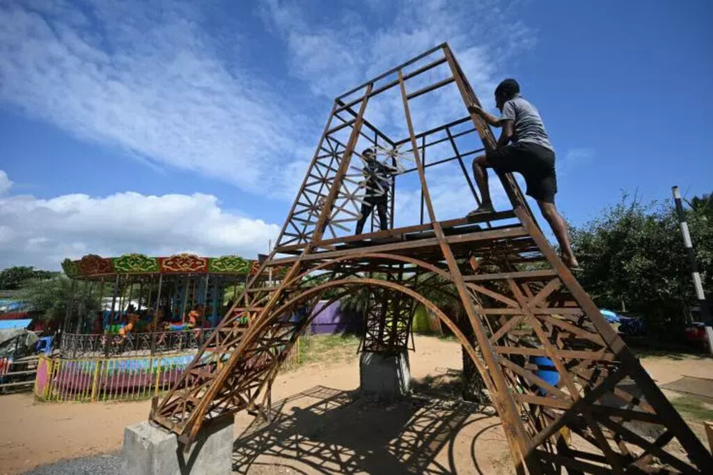 | Des ouvriers construisent une réplique de la Tour Eiffel le 18 janvier à Pondichéry, en Inde. |