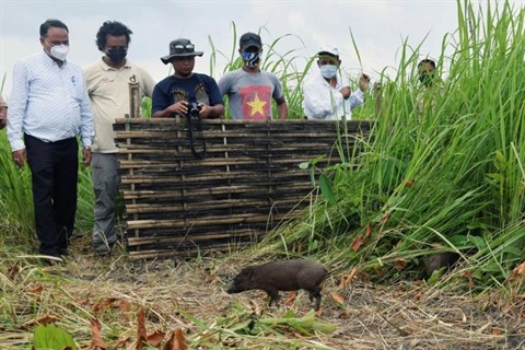 | Des responsables du parc national de Manas observent des porcs pygmées, les plus petits porcs du monde, relâchés dans la nature après leur élevage en captivité, le 26 juin en Inde. |