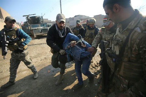 | Un homme suspecté d'être un membre de l'EI fait prisonnier par des soldats des forces irakiennes le 1er janvier à Mossoul. |