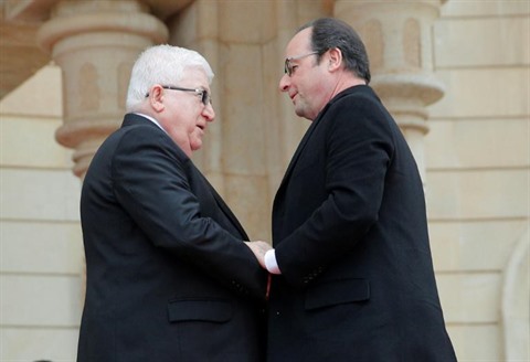 | Le président François Hollande (droite) accueilli par son homologue irakien Fouad Massoum à son arrivée au palais présidentiel le 2 janvier à Bagdad |