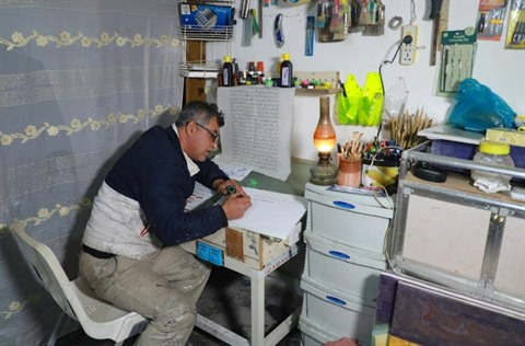 | Le calligraphe irakien Jamal Rassoul Hussein, chez lui dans son atelier à Raniye, en Irak, le 17 décembre. |