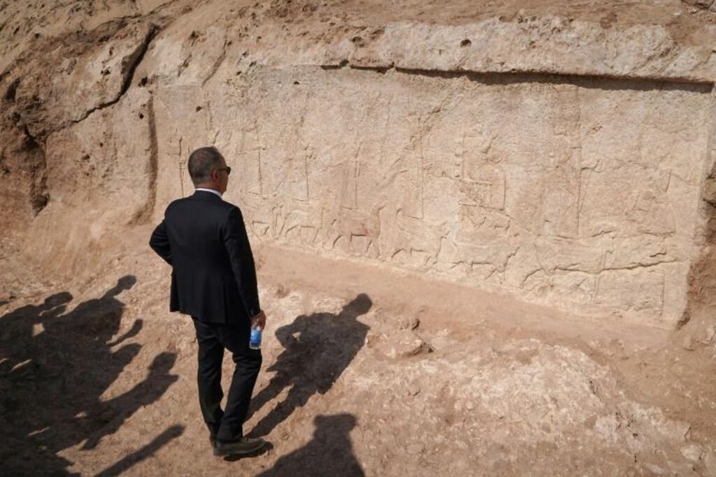 | L'ambassadeur d'Italie en Irak devant l'un des bas-reliefs découverts sur le site archéologique de Faida, le 16 octobre. |