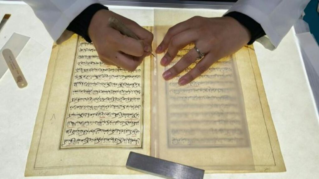Dans une salle attenante, une restauratrice en blouse blanche époussète à l'aide d'une brosse une planche de calligraphie aux bords rongés. Sa voisine utilise un stylet de découpage sur du "papier Japon". Les fins morceaux seront collés pour combler les trous sur les pages d'un livre du XVIIe siècle en persan consacré à l'Achoura, une commémoration religieuse chiite.