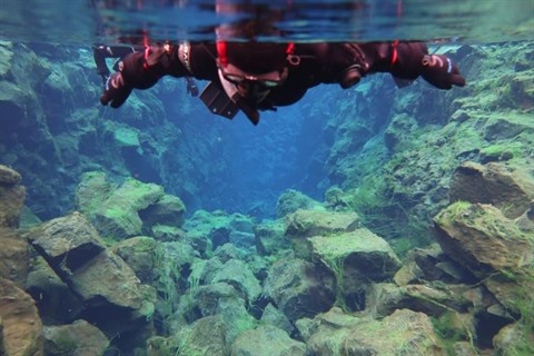 Au cœur du Parc national de Thingvellir, en bordure d'un des plus grands lacs islandais, ces couloirs de rochers immergés forment de profondes cavités - dont l'une dépasse les 60 mètres - nichées entre les deux continents, qui s'éloignent d'environ deux centimètres chaque année.
