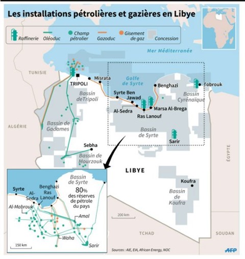 | Localisation des installations pétrolières et gazières en Libye. |