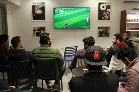 | Les Libyens suivent à la télé le match opposant leur équipe nationale à la Tunisie pour les éliminatoires de la CAN à Benghazi, le 25 mars. |