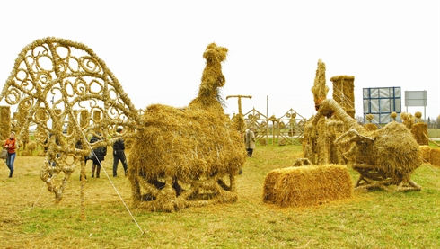 Accueilli par une carpe en paille mesurant deux mètres sur deux, le visiteur est immédiatement plongé dans l’ambiance d’un marché de campagne : des poules, une oie, un cochon y entourent une taverne et un four de boulanger de quelques mètres de haut. Le tout réalisé depuis septembre par des employés d’une maison de la culture et des habitants du village de Naujamiestis.