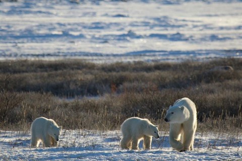 | Une ourse polaire et ses petits en 2015 au Canada. |