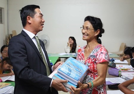 | Hoàng Minh Son, consul général du Vietnam en Australie remet des matériels didactiques à Nghi Michelle, professeur de la classe de vietnamien. |