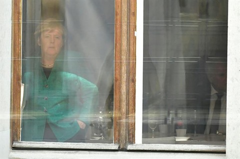 | La chancelière allemande Angela Merkel regarde par la fenêtre lors d'une rencontre avec le leader de la CSU bavaroise, Horst Seehofer, à Berlin, le 18 octobre. |