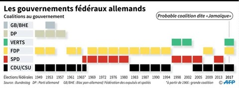 | Chronologie des gouvernements fédéraux allemands de coalition de 1949 à 2017 avec la probable coalition dite "Jamaïque" après le scrutin du 24 septembre. |