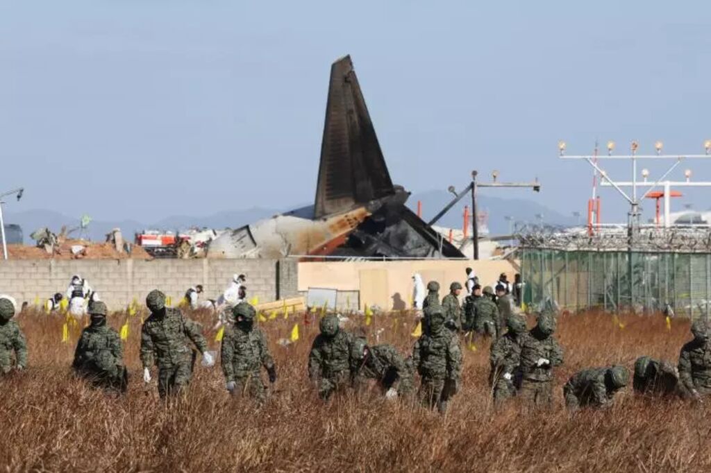 | Des militaires effectuent des recherches aux alentours du lieu du crash du Boeing 737-800 de Jeju Air à Muan, en République de Corée, le 31 décembre. |