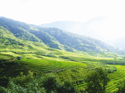 En effet, quand les montagnes russes se terminent, se dévoile une mer de riz ondulant au gré du vent. Ses tendres mouvements caressent notre regard comme si elle voulait nous apaiser après ce fatigant voyage. Je suis fasciné de contempler des parcelles verdoyantes s’étendre à perte de vue et se succéder verticalement du pied à la cime des montagnes comme des échelles géantes menant au ciel. Le vert foncé des forêts apporte des notes graves à cette émeraude, faisant de Ban Mù une palette de vert harmonieuse.