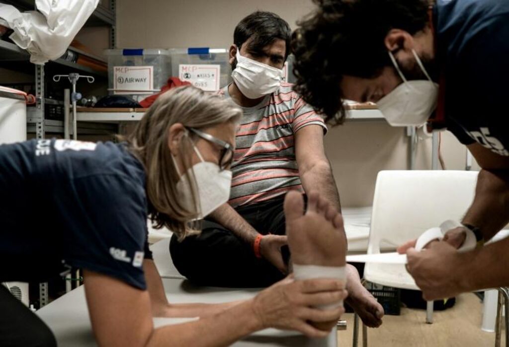 | Des membres d'une ONG soignent le pied d'un migrant à bord du navire humanitaire Ocean Viking, près de la Sicile, en mer Méditerranée, le 6 novembre. |
