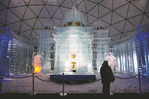 | Une touriste visite la réplique miniature en glace de la Basilique Saint-Pierre de Rome, en Slovaquie. |