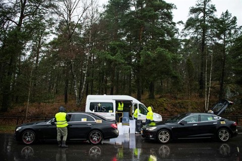 | Des chauffeurs de taxi rapportent des tests PCR effectués par des personnes présentants des symptômes du COVID-19, le 4 décembre à Stockholm. |