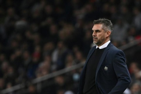 | L'entraîneur de Lille, Jocelyn Gourvennec, en costume Izac pendant le match de L1 contre le PSG au Parc des Princes, le 29 octobre 2021 à Paris. |