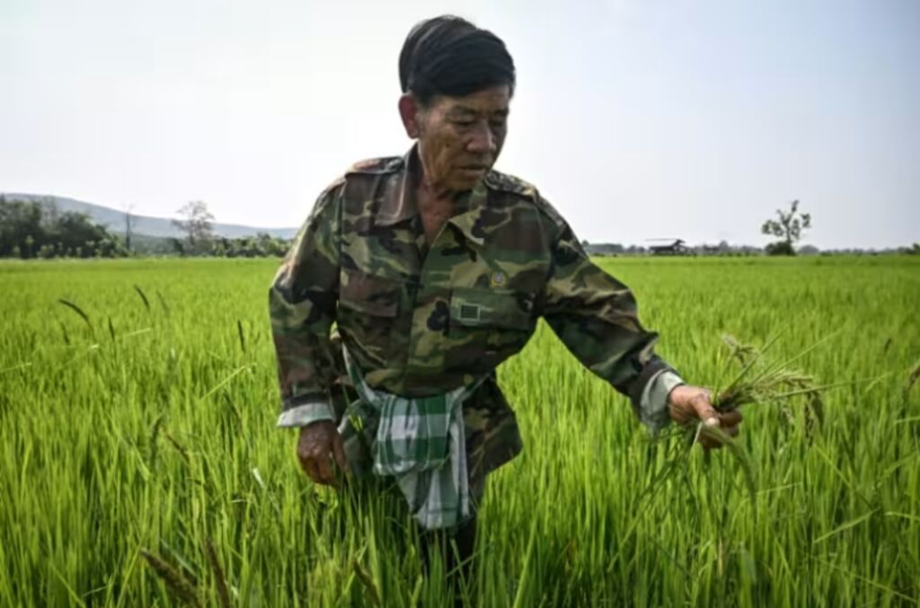 | Un agriculteur inspectant une rizière qui vient d'être traitée avec la solution microbienne Soil Digest, dans la province de Chiang Rai en Thaïlande, le 18 mars. |