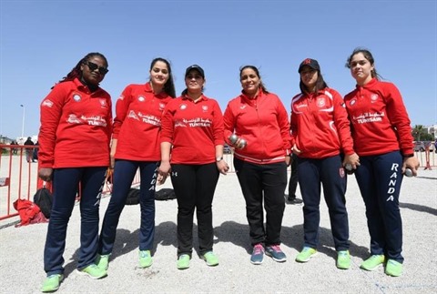 | Les membres de l'équipe féminine de pétanque tunisienne lors d'un tournoi à Hammamet, le 31 mars. |