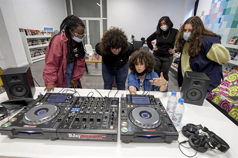 | Yasmina Gaida, alias Fouchika Junior (centre), initie aux bases du mixage de futures DJ à l’Institut français à Tunis. |
