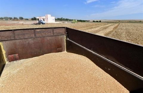 Dans sa ferme, odeur de paille et ronronnements de moissonneuses-batteuses : la saison de la récolte bat son plein. Le blé est mis dans des sacs blancs, puis pesé séparément, afin de calculer la productivité de chaque parcelle. "Et les résultats sont bons", se félicite M. Ben Saleh.