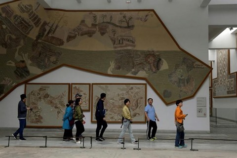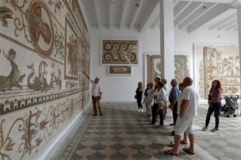 | Des touristes admirent une mosaïque exposée au Musée du Bardo dans la capitale tunisienne, Tunis, le 3 octobre. |