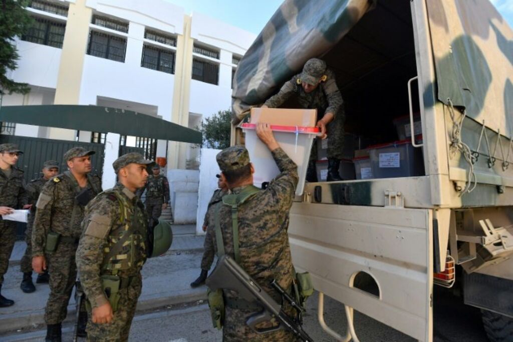 | Des militaires livrent des urnes à la veille de l'élection présidentielle en Tunisie, à Ariana, le 5 octobre 2024. |