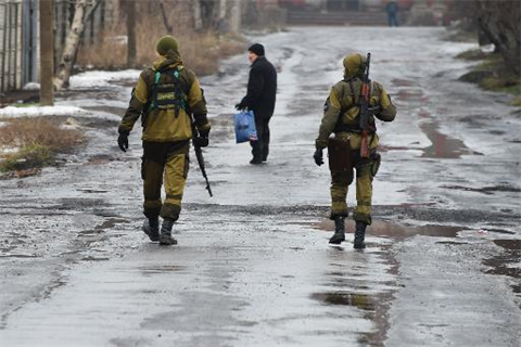 | Des combattants séparatistes dans une rue de Makiivka dans la banlieue de Donetsk à l'Est de l'Ukraine le 1er février. |