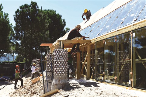 | Le célèbre architecte américain Michael Reynolds (centre), travaille pendant la période de construction de l’École primaire N°294. |