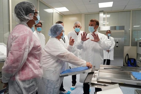 | Le président français Emmanuel Macron (droite) visite le laboratoire de Sanofi-Pasteur à Marcy-l'Étoile, près de Lyon, le 16 juin. |