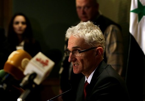 | Le secrétaire général adjoint de l'ONU pour les affaires humanitaires, Mark Lowcock, s'adressant à la presse à Damas à la fin de sa première visite en Syrie le 11 janvier. |