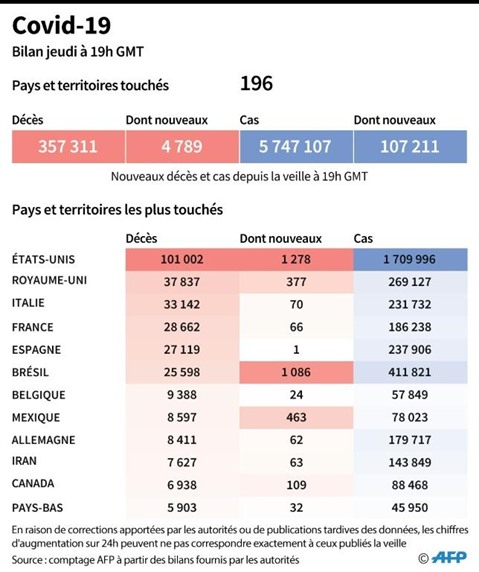 En cinq mois, de fin décembre et l'apparition déclarée du coronavirus à Wuhan (Chine centrale), à fin mai, le coronavirus a tué environ 360.000 personnes, et en a infecté plus de 5,8 millions. Des chiffres officiels à relativiser, car sans doute en-deçà de la réalité. Les États-Unis, pays de loin le plus touché (plus de 1,7 million de cas), avaient répertorié moins de 700 décès quotidiens pendant trois jours, mais la courbe est repartie à la hausse mercredi 27 mai et jeudi 28 mai, avec respectivement 1.401 et 1.297 nouvelles pertes. Et le seuil symbolique des 100.000 morts a été franchi.