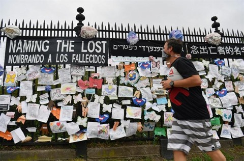 | Un homme portant un masque de protection passe devant un mémorial aux personnes mortes du coronavirus, le 28 mai au cimetière de Greenwood, à New York |