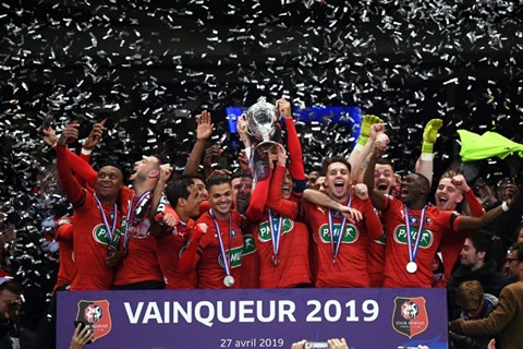 | Les joueurs de Rennes soulèvent la Coupe de France, le 27 avril 2019, au Stade de France. |