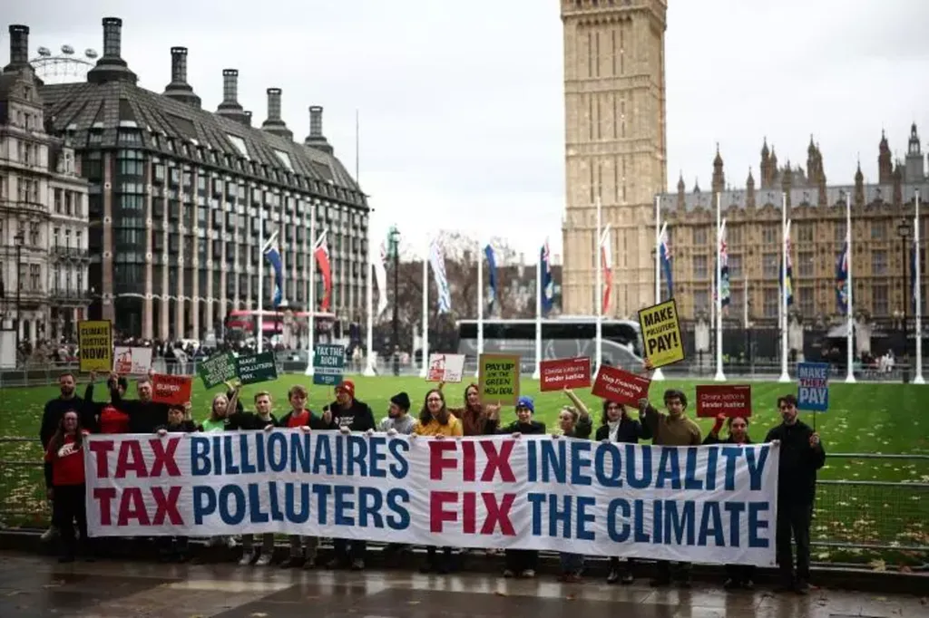 | Des militants brandissent une banderole sur laquelle on peut lire "Taxer les milliardaires, corriger les inégalités, taxer les pollueurs, régler le problème du climat" devant le Parlement à Londres le 24 novembre 2025 en Angleterre. |