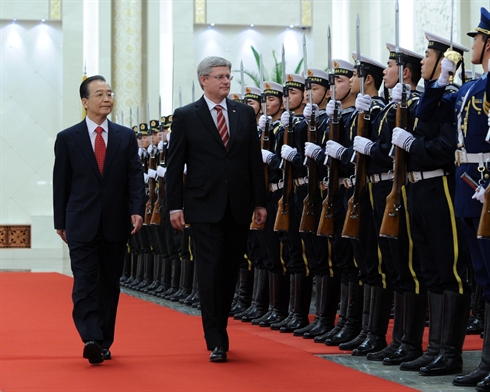 | Le Premier ministre chinois Wen Jiabao (gauche) et son homologue canadien Stephen Harper passent en revue la garde d'honneur chinoise, le 8 février à Pékin. |