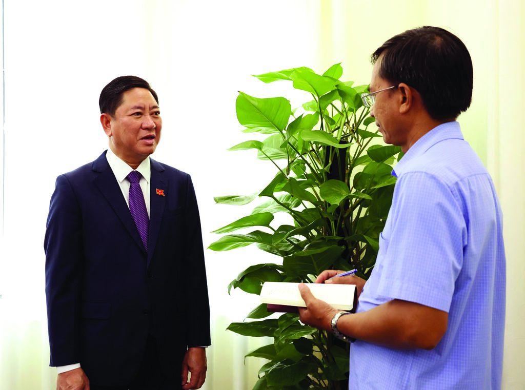 | Le président du Comité populaire de Ninh Thuân, Trân Quôc Nam (gauche), accorde une interview à l’Agence Vietnamienne d’Information. |