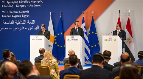 | Le Premier ministre grec Kyriakos Mitsotakis (centre) s'exprime aux côtés du président égyptien Abdel Fattah El-Sisi (droite) et du président chypriote Nicos Anastasiades à Athènes le 19 octobre. |