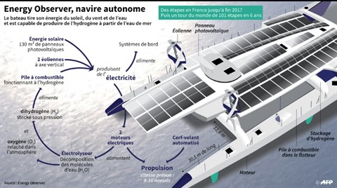 Energy Observer doit effectuer un tour du monde pendant six ans à raison d'une centaine d'escales. D'un coût de 5,5 millions d'euros pour sa transformation, puis de 4 millions d'euros par an dont le budget est à moitié bouclé, il a été conçu avec une équipe d'architectes navals et l'institut de recherche CEA-Liten, dédié aux énergies nouvelles.