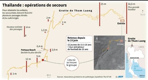 Dimanche 8 juillet, quatre garçons ont revu la lumière du jour, grâce à des plongeurs expérimentés qui les ont guidés le long d'un parcours tortueux, marqué par des portions inondées et étroites, en particulier un passage très difficile à franchir, dans lequel il faut se faufiler, qui est le cauchemar de la cellule de crise.
