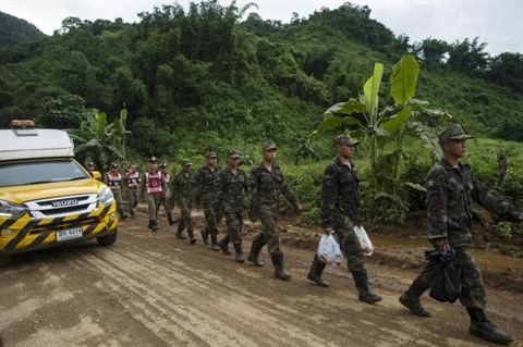| Des soldats thaïlandais poursuivent les opérations d'évacuation pour libérer 12 enfants et leur entraîneur de football bloqués dans la grotte de Tham Luang, le 7 juillet à Mae Sai. |