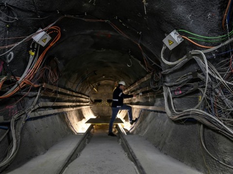 | Le géologue Christophe Nussbaum, responsable du Laboratoire international du Mont Terri, inspecte un tunnel expérimental pour l'enfouissement des déchets radioactifs, le 6 avril 2022 près de Saint-Ursanne, en Suisse. |