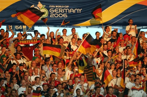 | Des supporteurs allemands et portugais au début de la petite finale lors du Mondial-2006 le 8 juillet 2006 à Stuttgart (Sud-Ouest de l'Allemagne) |