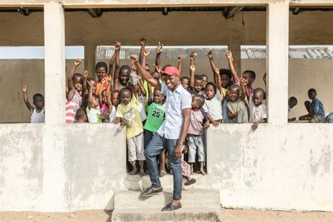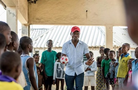 | Des enfants jouent le 5 décembre 2018 avec Berger Oketan, membre de l'ONG MAEJT (Terre des Hommes et le Mouvement des Associations d'Enfants et de Jeunes Travailleurs), à Xwlacodji, dans la ville béninoise de Cotonou. |