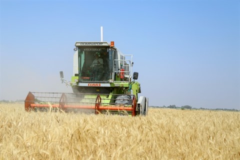 M. Hamed a planté un quart de ses 100 donums (10 ha). Dans ses champs, la moissonneuse-batteuse fait des aller-retours méthodiques pour couper les épis mûrs. Les grains sont projetés dans la benne d'un camion.